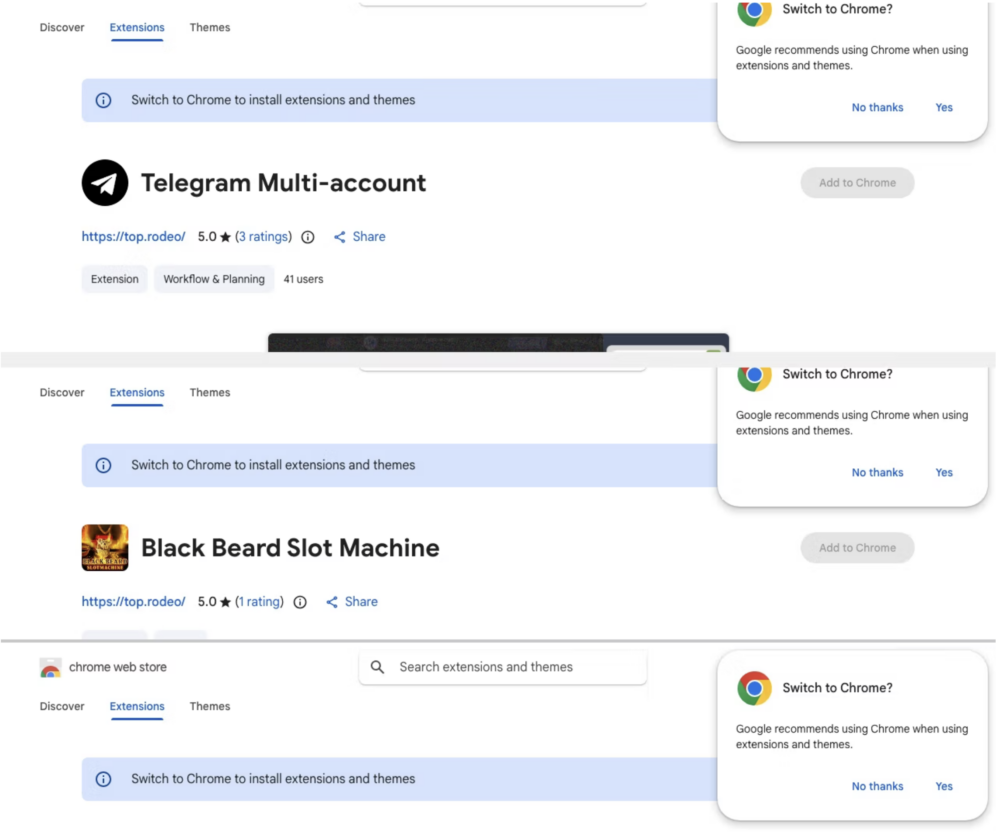 Prawie połowa z nich wykrada informacje o koncie Google, jedna przejmuje również sesje Telegram Web, a inne wstrzykują reklamy (m.in. na YouTube, TikTok). Rozszerzenia są zróżnicowane, zapewne aby dotrzeć do różnych grup użytkowników. Znaleźć można zarówno dodatki do obsługi Telegrama, gry, narzędzia ulepszające YouTube i TikTok czy wtyczki do tłumaczeń.