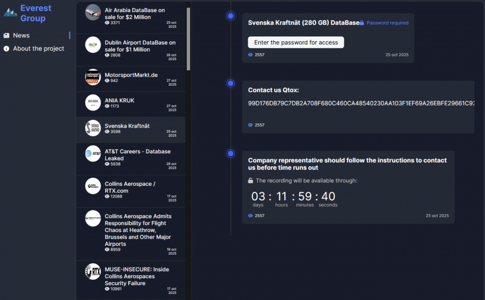Na portalu ransomware.live pojawiła się informacja o ataku na firmę Svenska Kraftnät – szwedzkiego operatora sieci przesyłowej energii elektrycznej. Za incydent odpowiada grupa Everest, znana z działalności w środowisku rosyjskojęzycznych grup cyberprzestępczych. Na jednym z forów w darknecie opublikowała licznik, po upływie którego wykradzione dane mają zostać ujawnione. Mowa o ok. 280 GB bliżej nie określonych danych.