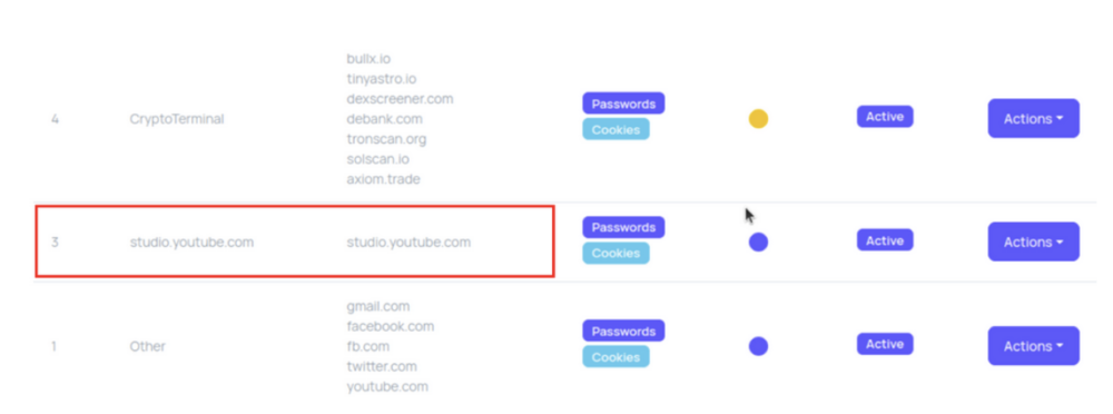 Co ciekawe, w panelu administracyjnym został założony specjalny trigger (marker), który w momencie wykrycia w pozyskanych logach ciasteczka pochodzącego z domeny studio.youtube.com automatycznie nadawał mu etykietę VIP. Obecność ciasteczka potwierdza, że użytkownik posiada kanał na YouTubie, co czyni go wartościowym celem.