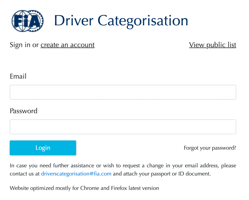 Rysunek 1. Portal logowania do aplikacji FIA pozwalającej na uzyskanie kierowcom kategorii uprawniającej do startu (źródło)