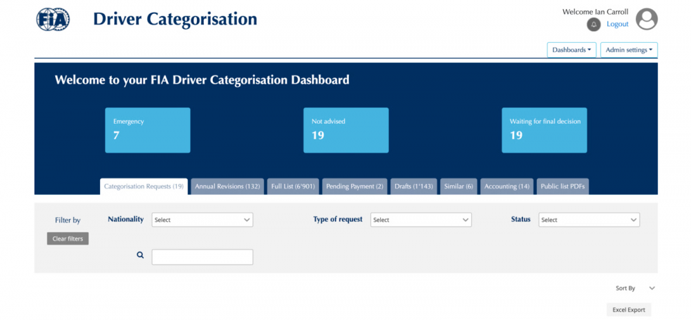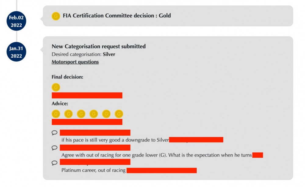 Zainteresowani startami w wydarzeniach organizowanych pod egidą Fédération Internationale de l’Automobile, mogą ubiegać się o wymaganą kategorię w ogólnodostępnym portalu drivercategorisation[.]fia[.]com. Aplikacja wspiera self-registration, czyli każdy kierowca może sam założyć sobie konto, a następnie wgrywając odpowiednie dokumenty poprosić o wydanie kategorii uprawniającej do startu. Oczywiście F1 wymaga posiadania jeszcze Super Licencji wydawanej na podstawie innego zestawu wymagań (np. określonej liczby zgromadzonych punktów lub minimum przejechanego dystansu za “sterami” bolidu). Jednak jak podkreślają badacze, elitarni kierowcy pojawiają się również w portalu z kategoriami. Super Licencja daje z automatu platynową kategorię FIA.