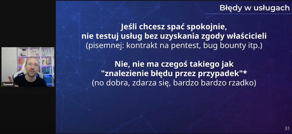 Ścieżkę otworzył Gynvael Coldwind, absolutna legenda.  W tradycyjnie przystępny sposób opowiedział o tym, jak zgłaszać błędy bezpieczeństwa, aby… nie oberwać po łapach 😏