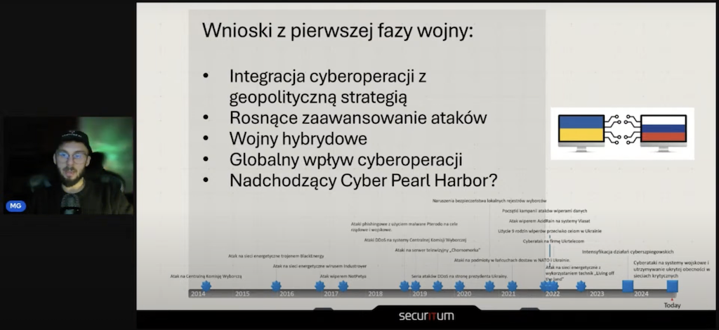 Po przerwie nastąpiła prezentacja technik geolokalizacji, czyli historii poszukiwań pewnego szpiega, którą przedstawił Rafał Godek, oraz przybliżenie (niezwykle na czasie) tematu wojny rosyjsko-ukraińskiej w cyberprzestrzeni. Wystąpienie przygotował Maciej Góra.