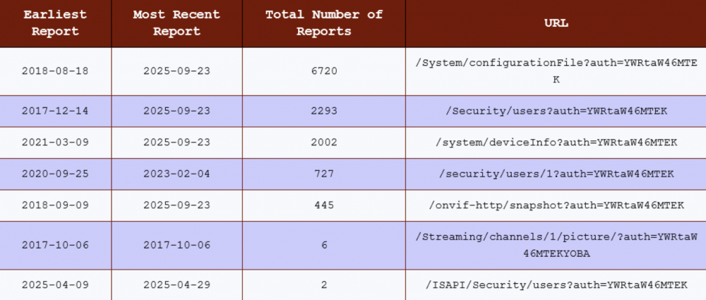This „auth” string has been around for a while for a number of Hikvision-related URLs. Until this week, the particular URL never hit our threshold to be included in our reports. So far, the „configurationFile” URL has been the most popular. It may give access to additional sensitive information.