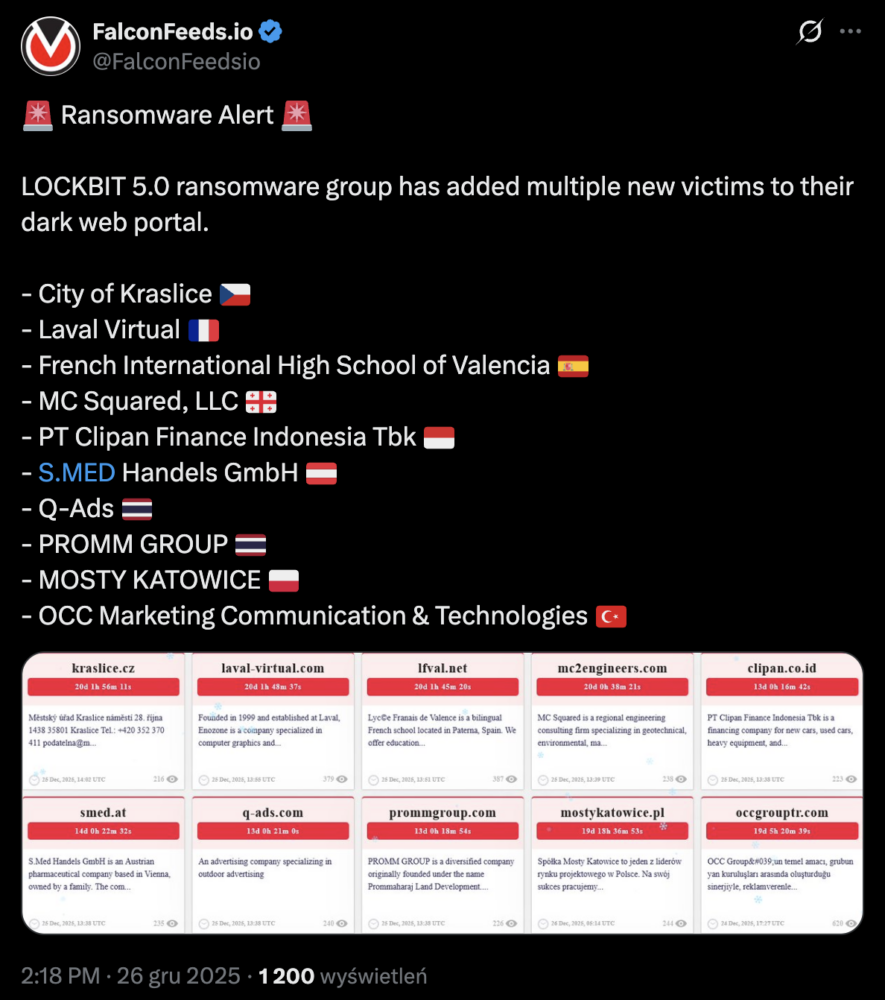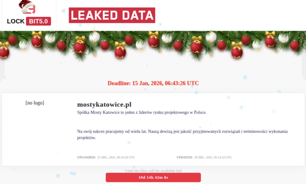 Na stronie typu shame site (strona w sieci Tor, gdzie przestępcy chwalą się udanymi atakami) prowadzonej przez grupę Lockbit 5.0, pojawił się nowy wpis dotyczący domeny mostykatowice.pl. Atak został odnotowany 25 grudnia, zgodnie z informacjami z portalu ransomware.live.