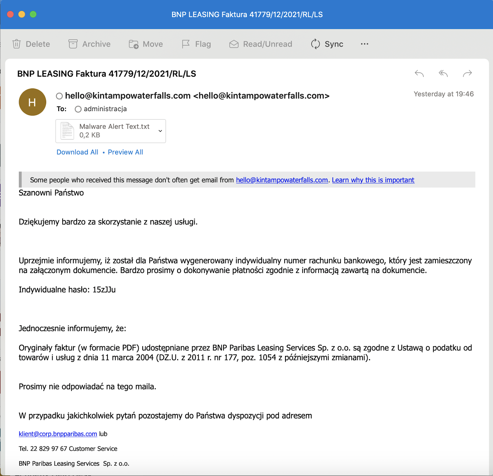 Niedawno pojawiła się nowa kampania phishingowa skierowana do polskojęzycznych odbiorców. Twórcy malware używając poprawnej polszczyzny namawiają swoje ofiary do otwarcia aktualnej faktury za leasing w banku BNP Paribas, w związku z wygenerowaniem nowego, indywidualnego rachunku bankowego: