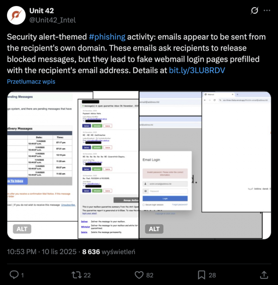 Badacze z Unit42 ostrzegają na X o nowej kampanii phishingowej, w której cyberzbóje podszywają się pod powiadomienia o „niedostarczeniu wiadomości” z filtrów antyspamowych wewnątrz organizacji. Celem jest zwabienie ofiary na stronę phishingową, która kradnie dane logowania.