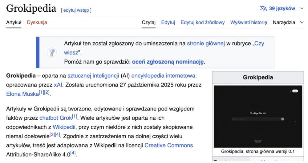 Nie obyło się oczywiście bez kontrowersji. Pomimo deklaracji o byciu lepszą alternatywą, wiele artykułów w Grokipedii zostało zaadaptowanych od konkurencji z adnotacją, że treść pochodzi z Wikipedii i jest udostępniana na licencji Creative Commons (CC BY-SA 4.0). Swoją drogą, encyklopedia Muska dorobiła się już swojego artykułu na Wiki i nie obyło się bez prztyczka w nos.