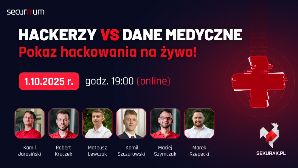 Czy dane dotyczące Twojego zdrowia mogą kiedyś ujrzeć światło dzienne? Czy niedopatrzenie jednej osoby może narazić na szwank bezpieczeństwo całego szpitala? Zapraszamy na bezpłatne szkolenie Hackerzy vs dane medyczne. Pokaz hackowania na żywo, które ma na celu nie tylko uświadomienie zagrożeń, ale także podkreślenie, jak istotne są właściwe procedury bezpieczeństwa i regularne testy penetracyjne w ochronie poszczególnych systemów zawierających dane wrażliwe. Kiedy? 1 października br., godz. 19.00 (online). Możesz się zapisać na wydarzenie zupełnie za darmo, możesz nas wesprzeć dowolną kwotą (min. 20 zł), możesz też kupić bilet z dostępem do nagrania, certyfikatem, a nawet gadżetami*.