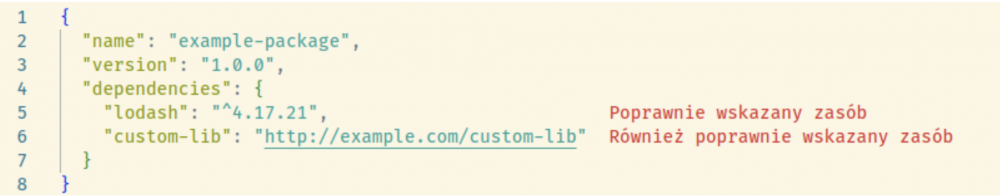 Kiedy użytkownik instaluje pakiet z tego typu zależnością, npm pobiera ją ze wskazanego zewnętrznego adresu URL. Nie z oficjalnego repozytorium npm tylko z dowolnego miejsca, które zdefiniuje atakujący.
