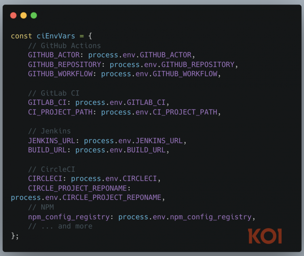 Na początku malware przeszukuje całe środowisko w poszukiwaniu adresów e-mail – sprawdza zmienne środowiskowe, plik .gitconfig, .npmrc, a także pole autora w pliku package.json. Następnie szuka konfiguracji środowiska CI/CD – pozyskuje tokeny GitHub Actions, dane uwierzytelniające GitLab CI, Jenkins, CircleCI.