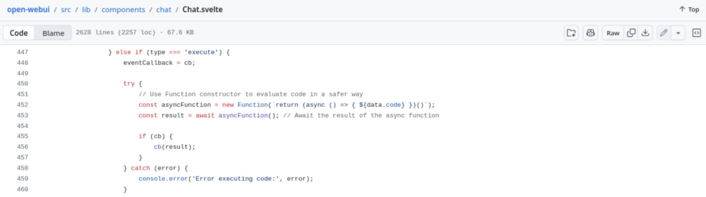 W naszej ocenie zewnętrzne API, nawet jeśli zostanie dodane przez administratora instancji, nie powinno mieć możliwości wykonywania kodu w przeglądarce użytkownika (chyba, że taki będzie jasny cel i użytkownik się na to zgodzi). W przypadku Open WebUI użytkownik spodziewa się odpowiedzi LLM na zadane pytanie, a nie kodu który natychmiast zostanie u niego wykonany.