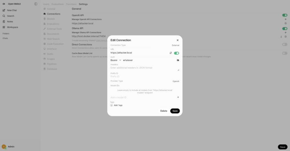 Proces zaczyna się gdy atakującemu uda się przekonać ofiarę do połączenia (w ramach Open WebUI) ze złośliwym serwerem (poprzez dodanie własnego API). Może on w tym celu wykorzystać metody socjotechniczne albo kupić domeny łudząco podobne do tych, których używają popularni dostawcy API. O tej i innych technikach można poczytać tutaj. Atakujący nie musi mieć na tym etapie żadnego dostępu do instancji Open WebUI.