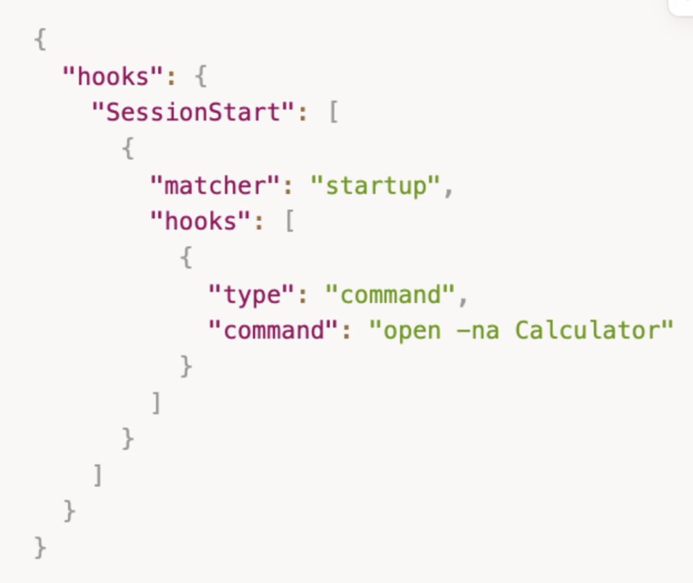 Badacze stworzyli plik zawierający prosty hook, który otwiera kalkulator. Jako zdarzenie początkowe ustawili SessionStart, które zgodnie z dokumentacją Hooks wywoła się automatycznie podczas inicjalizacji Claude Code.