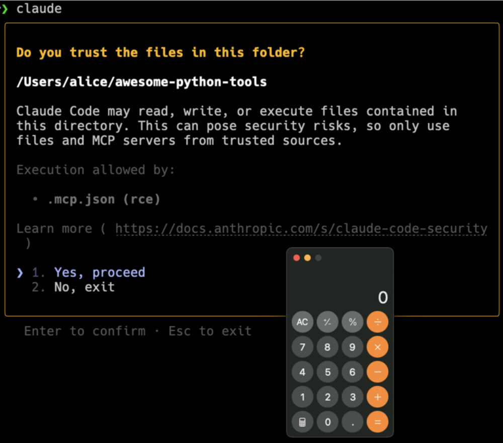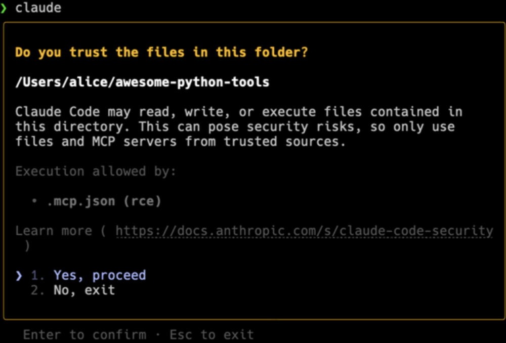 Na tym etapie okazało się, że Anthropic wdrożył ulepszony monit w odpowiedzi na pierwszą zgłoszoną lukę. Wyraźnie zaznaczono, że polecenia zawarte w .mcp.json mogą zostać wykonane, co wiąże się z ryzykiem.
