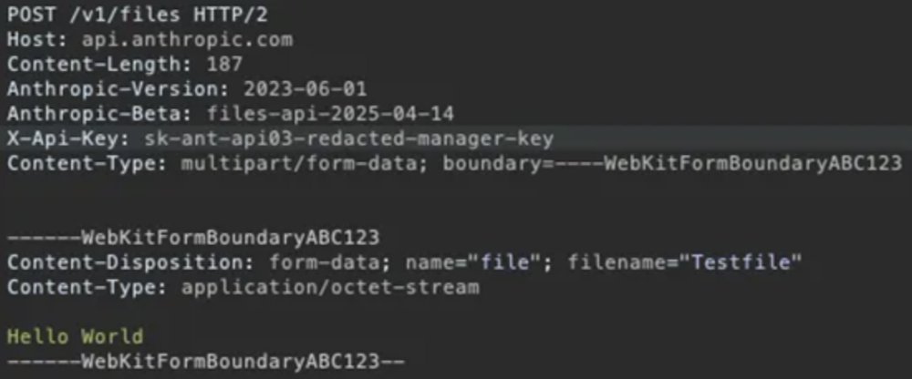 Aby przetestować to w praktyce, badacze stworzyli workspace z dwoma kluczami API i wgrali plik przez takie żądanie: