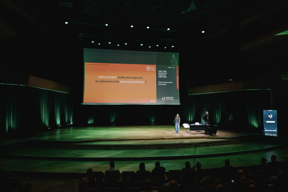 Na wstępie Tomek Turba, wspierany przez zaproszonych gości, otworzył konferencję z przytupem. Opowiedział o projekcie szkoleniowym, który w 2025 roku odmienił życie kilkudziesięciu adeptek cyberbezpieczeństwa. Szczegóły przedstawiła Paulina Polak – członkini fundacji Mamo Pracuj, czyli współorganizatora projektu Cyber Women Leaders. Projekt w sposób praktyczny przygotowywał kursantki do egzaminu CompTIA Security+ i był realizowany przez naszych topowych trenerów. Dodatkowo uczestniczki miały zajęcia z języka angielskiego oraz webinary i program mentoringowy. Planujemy szeroką ekspansję tego projektu (obserwujcie nasze social media!).
