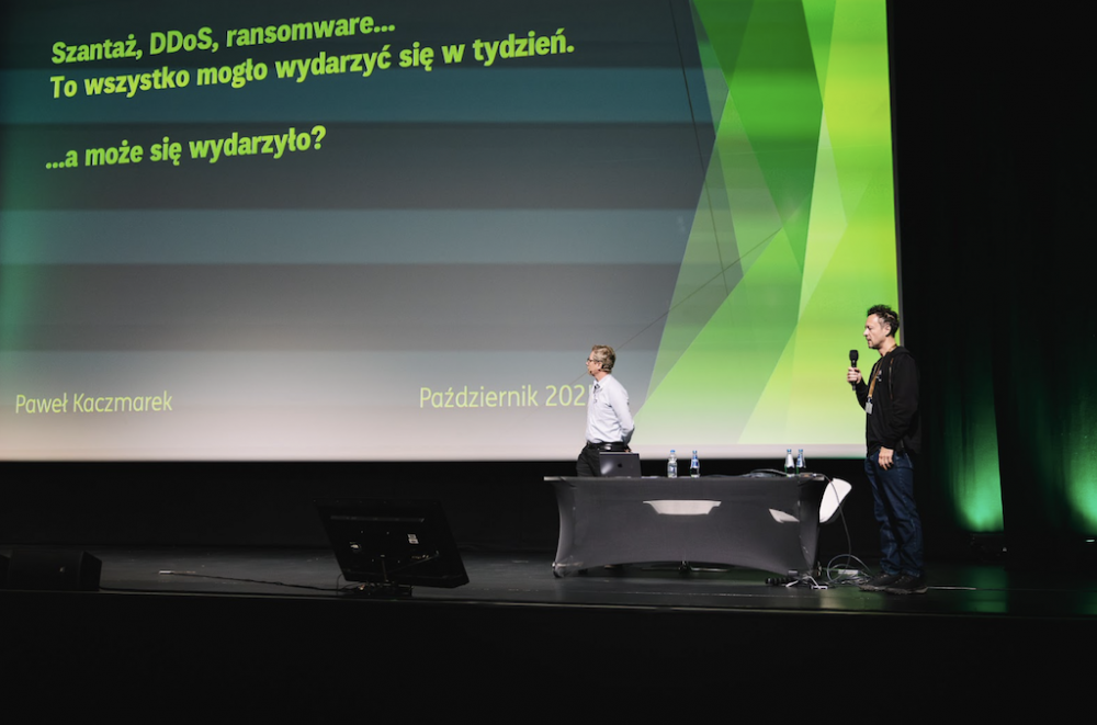 Następnie na scenę wkroczył Paweł Kaczmarek, CISO ING Bank Śląski, z… pytaniem rzuconym w salę: co robić, gdy w ciągu tygodnia spotykają nas szantaż, DDoS i ransomware? Opowiedział o złożonym scenariuszu ataku na bank, dzieląc się lekcjami o zarządzaniu kryzysowym pod presją czasu.