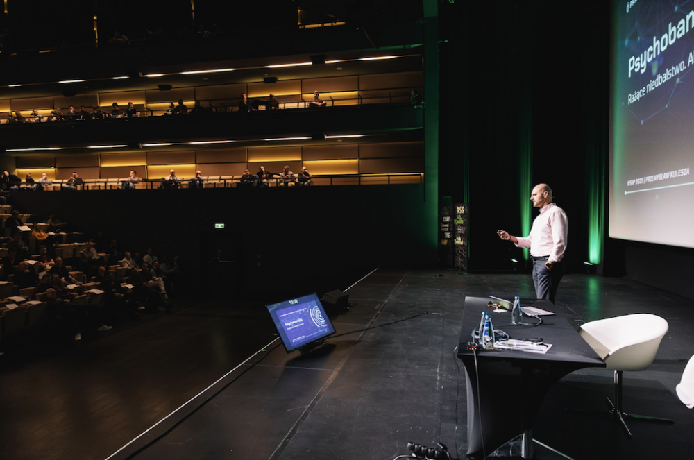 Szymon Martyniak-Barański połączył psychologię kliniczną z cyberbezpieczeństwem, pokazując, dlaczego inżynieria społeczna jest tak skuteczna. Odwołał się do Sparty i neurobiologii, tłumacząc, jak hackerzy grają na ludzkich emocjach. Sala słuchała jak zahipnotyzowana.