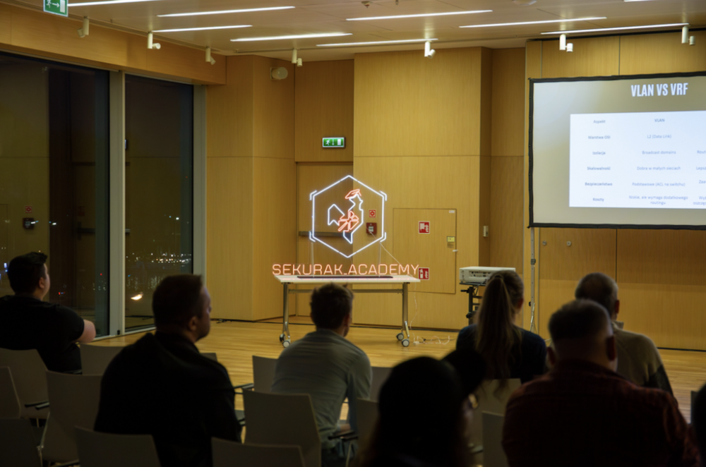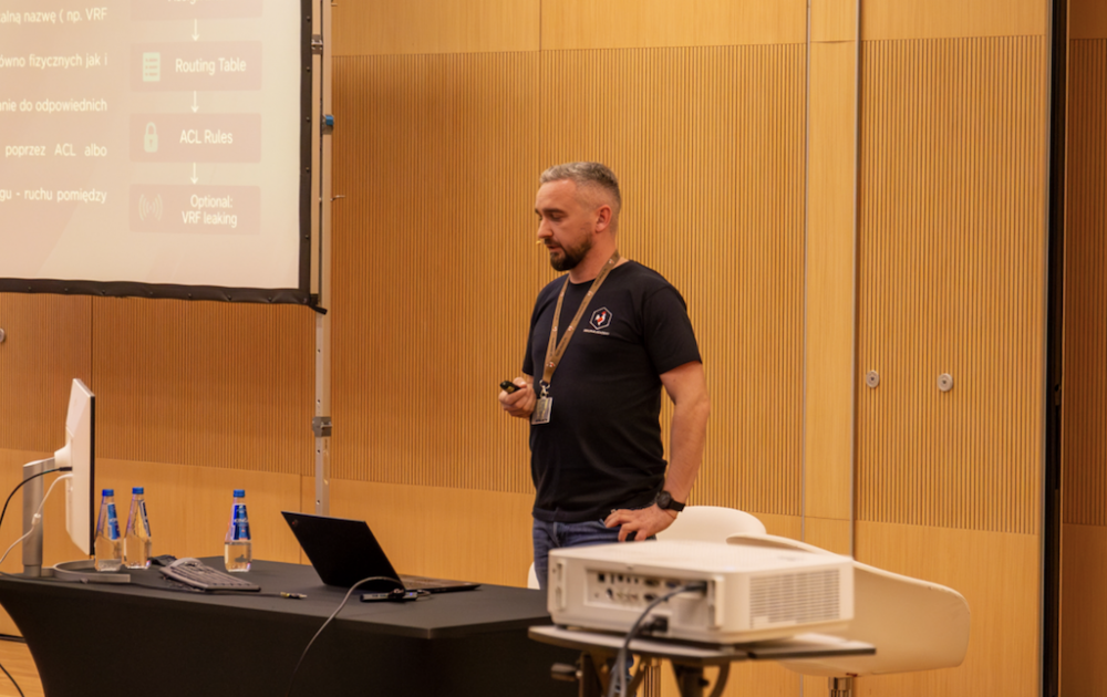 Przemysław Merta zamknął ścieżkę, tłumacząc, dlaczego segmentacja sieci to podstawa bezpieczeństwa. Porównanie VLAN i VRF, poparte praktycznymi przykładami wdrożeń, rozwiało mity o trudnościach VRF.