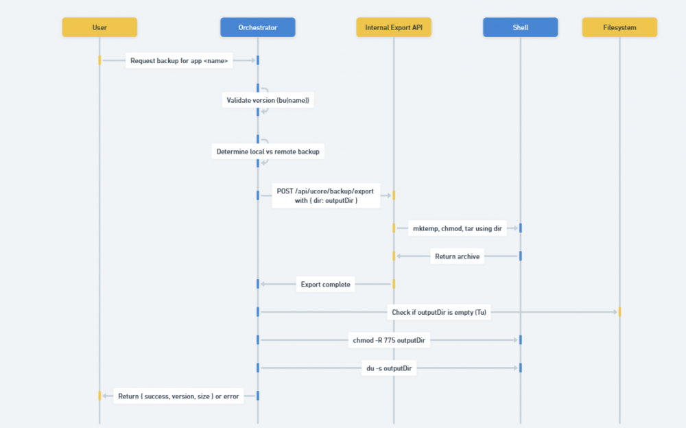 Analiza kodu Javascript orkiestratora wykazała, że wartość dir jest przyjmowana bez żadnej walidacji do endpointu http://127.0.0.1/:<appPort>/api/ucore/backup/export. Otrzymane w ten sposób dane są następnie wykorzystywane przy budowaniu poleceń powłoki mktemp, chmod, tar, du. Z racji tego, że dane te przekazywane są bez maskowania znaków specjalnych, zawarte w nich metaznaki interpretowane są jako nowe polecenia, co umożliwia wykonanie dowolnego kodu. Na skalę znaczenia tego problemu wpłynął także fakt, że wskazane zasoby miały być dostępne tylko na interfejsie pętli zwrotnej (loopback), jednak w wyniku błędnej konfiguracji wewnętrznego oprogramowania usługi te były dostępne także z zewnętrznej sieci. Warto nadmienić, że niezależnie od tego, sam fakt braku walidacji wprowadzanych danych umożliwiał wykonanie dowolnego kodu, a w efekcie przejęcie systemu.