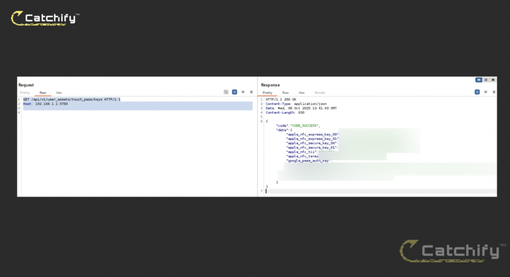 Ostatecznie dopasowując odpowiednio payload udało się odczytać zawartość pliku /etc/passwd, a także ustanowić reverse shell, co w praktyce oznaczało pełne przejęcie systemu, a co za tym idzie także możliwość zarządzania poświadczeniami NFC. Ponadto kolejne próby pozwoliły m.in na nieautoryzowany odczyt struktury JSON z danymi uwierzytelniającymi używanymi przez funkcje dostępu mobilnego/NFC, w tym wartościami kluczy Apple NFC Express/Secure, typem terminala, TTL oraz blokiem google_pass_auth_key zawierającym dane klucza prywatnego w formacie PEM wraz z identyfikatorem wersji. W tym przypadku do skutecznego naruszenia wystarczyło zwykłe żądanie GET wysłane do /api/v1/user_assets/touch_pass/keys.