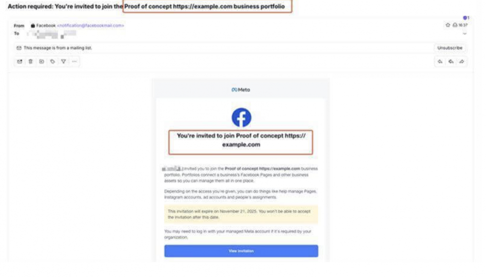 Cyberzbóje tworzą fałszywe strony firmowe na Facebooku, oznaczone logo i nazwą Meta. Następnie wykorzystują funkcję zaproszeń biznesowych na platformie, aby rozsyłać e-maile phishingowe.