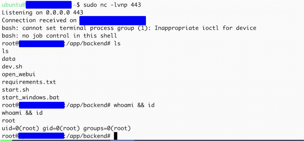 Efektem wywołania złośliwego prompta przez administratora instancji jest uzyskanie przez atakującego dostępu (reverse shell) do serwera, na którym hostowana jest aplikacja: