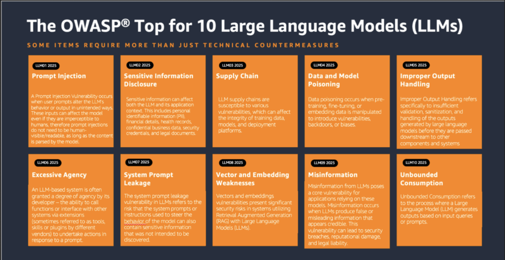 Projektując aplikacje oparte o duże modele językowe (LLM) należy zapoznać się z OWASP TOP 10 for LLM. Jest to bezpośredni odpowiednik OWASP TOP 10 dla aplikacji webowych, zawierający listę najczęściej występujących podatności w aplikacjach korzystających z LLM.