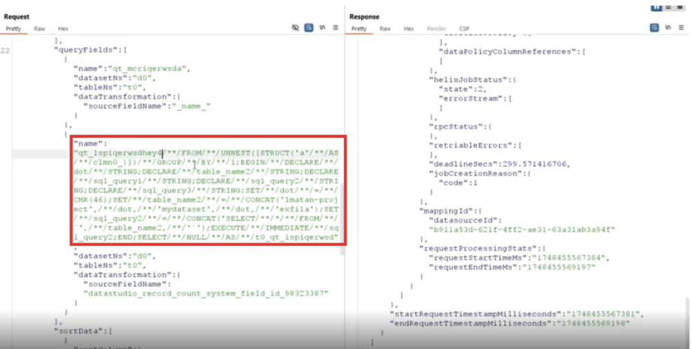 Okazało się, że Looker Studio generuje unikalne aliasy dla każdej kolumny, które jako JSON są przekazywane w ciele żądania. Backend pobierał te dane (de facto kontrolowane przez użytkownika) i… wstawiał je bezpośrednio do zapytania SQL, co oznaczało w tym przypadku możliwość nadania własnych aliasów w żądaniu kolumn z BigQuery: