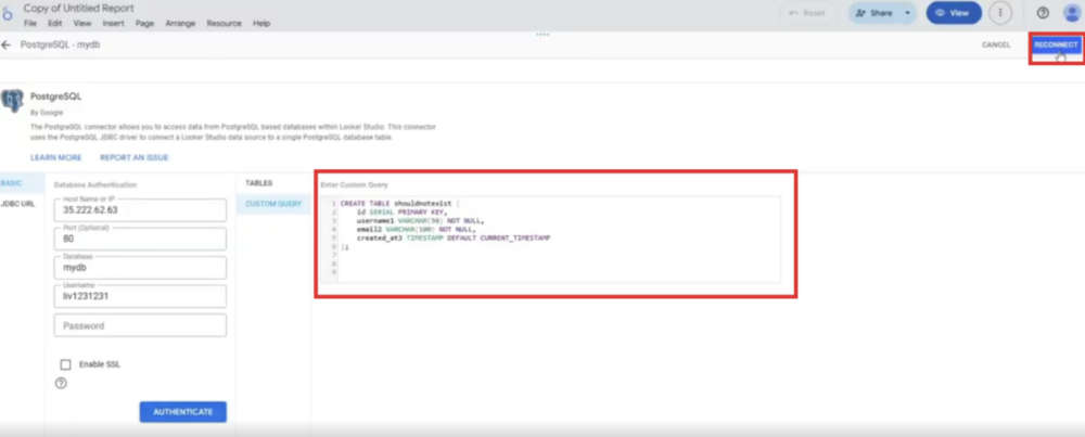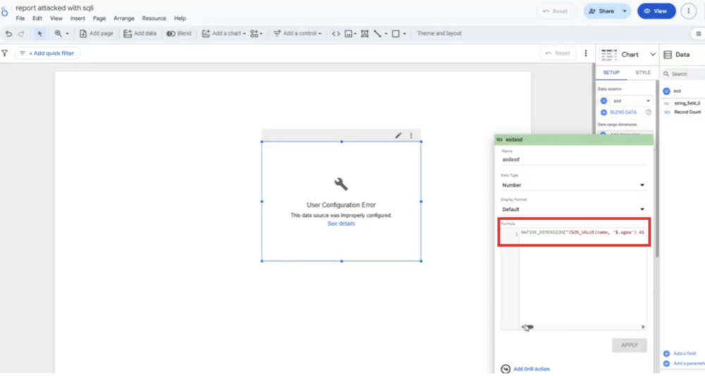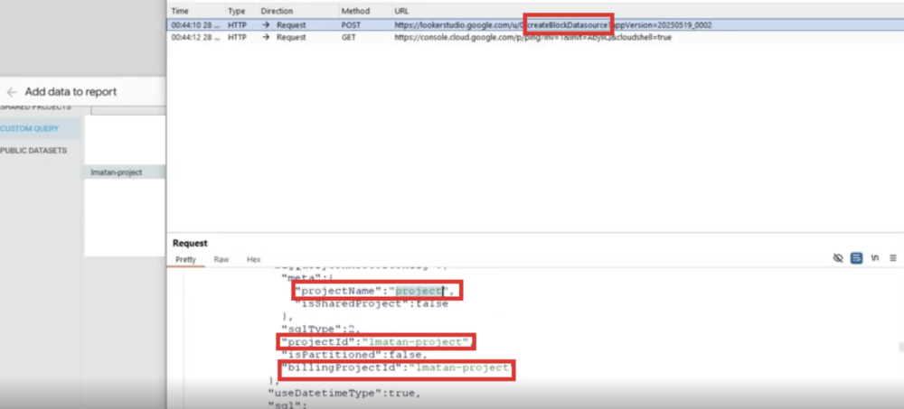 Funkcja ta pozwala wykonywać polecenia SQL bezpośrednio w Looker Studio, a backend uruchamia je w bazie danych, aby w raporcie zwrócić ich wynik. Dzieje się to podczas wyświetlania raportu. Można było więc – modyfikując żądania – dodać źródło danych należące do “ofiary”, dodać dimension z złośliwym zapytaniem SQL i udostępnić raport ofierze.