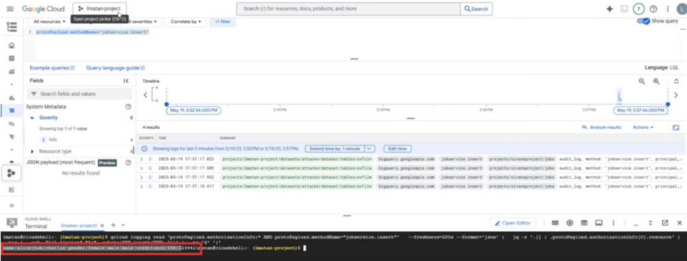 - Złośliwy skrypt uruchamia się, wyodrębniając wszystkie nazwy tabel i kolumn BigQuery w projekcie ofiary, a następnie wszystkie dane z nich.