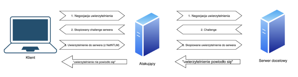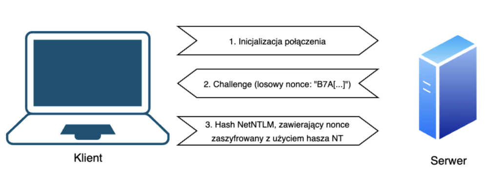 Warto na tym etapie zadać sobie pytanie: co jeżeli atakujący znajdujący się w lokalnej sieci LAN będzie w stanie podszyć się pod serwer do którego następuje uwierzytelnienie, i przechwycić NetNTLM przesłany przez użytkownika?