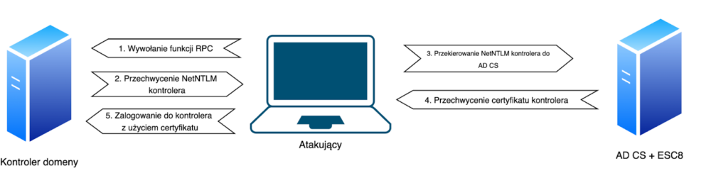 Rysunek 2. Schemat przedstawiający atak server-side coercion w praktyce: wywołanie zdalnej funkcji RPC na kontrolerze domeny, przekazanie zdobytych poświadczeń do usługi AD CS, i wygenerowanie certyfikatu kontrolera.