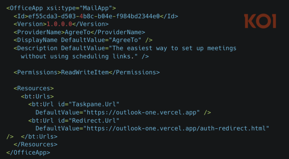 Phishing nie był jednak najgorszym możliwym scenariuszem. Manifest AgreeTo deklarował uprawnienie ReadWriteItem, więc wtyczka mogła odczytywać i modyfikować e-maile użytkownika. Atakujący nie skorzystali z tej możliwości, ale teoretycznie mogliby z poziomu JavaScript “po cichu” odczytać zawartość skrzynki ofiary i wykraść treść jej wiadomości lub nawet wysyłać maile w jej imieniu. Uprawnienie zostało przyznane przez Microsoft przy tworzeniu wtyczki, jednak jest ważne praktycznie bezterminowo.