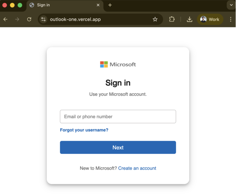 Google ostatecznie usunęło martwe rozszerzenie z Chrome Web Store w lutym 2025 roku. Jednak dodatek do Outlooka pozostał wystawiony w sklepie Microsoftu, nadal wskazując na URL z Vercel, który już do nikogo nie należał. Atakujący przejął więc “zwolnioną” subdomenę i zaczął serwować na niej stronę phishingową, która wyłudzała dane logowania do kont Microsoft.