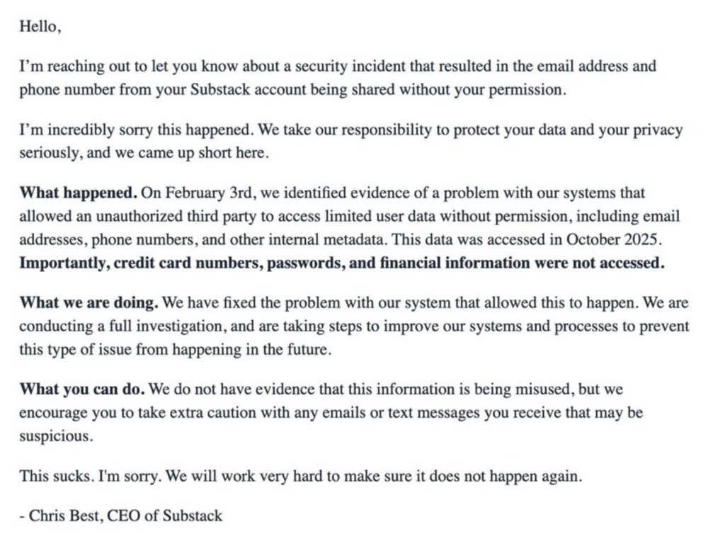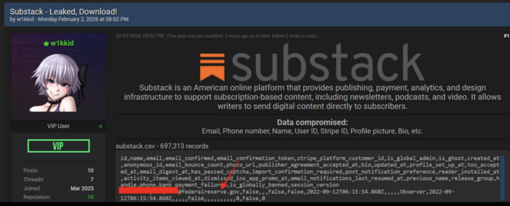 Substack to platforma, na której twórcy mogą tworzyć własne newslettery (także płatne) a użytkownicy – subskrybować i czytać ich treści. Z początkiem lutego użytkownik BreachForums poinformował, że uzyskał dane (prawie 700 tysięcy rekordów) użytkowników platformy. Firma potwierdziła fakt wycieku i wydała ogólny komunikat informujący użytkowników o sytuacji.
