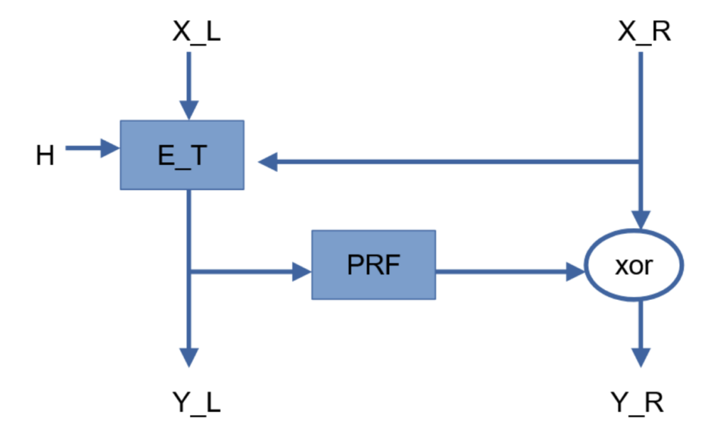 Jak widzimy na powyższym schemacie, dane wejściowe są dzielone na dwie części, odpowiednio krótsza lewa X_L oraz dłuższa prawa X_R. Część X_L jest podawana na wejście algorytmu E_T (zmodyfikowany AES-128) wraz z parametrem H (stałą predefiniowaną w protokole). Wynik Y_L jest podawany na wejście do PRF (Pseudo Random Function), w wyniku czego generowany jest keystream, zabezpieczający dalszą część wiadomości (XOR z wiadomością X_R). Wynikiem przeprowadzonej operacji jest szyfrogram Y_L || Y_R.