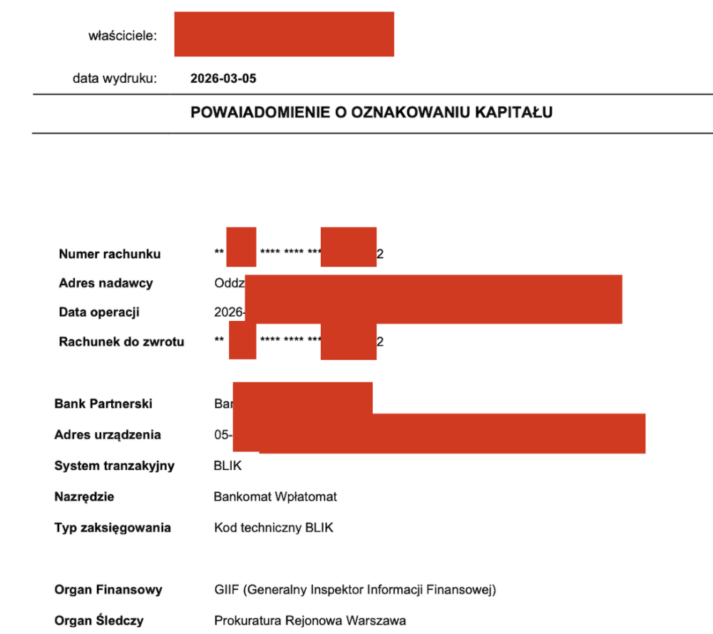 – [dzwoni telefon “z NBP”] Sprawa musi być zgłoszona do Generalnego Inspektora Informacji Finansowej oraz prokuratury. Pana konto staje się przedmiotem w sprawie i będzie zablokowane do 6 miesięcy.