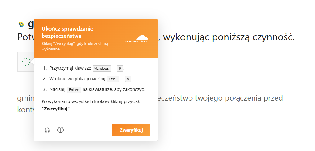 W ten sposób niczego nieświadome ofiary infekują swój komputer. Sam Cloudflare nie uczestniczy w całym procederze – jego logo po prostu zostało umieszczone przez atakujących na grafice wyżej – tak żeby uwiarygodnić całą akcję.