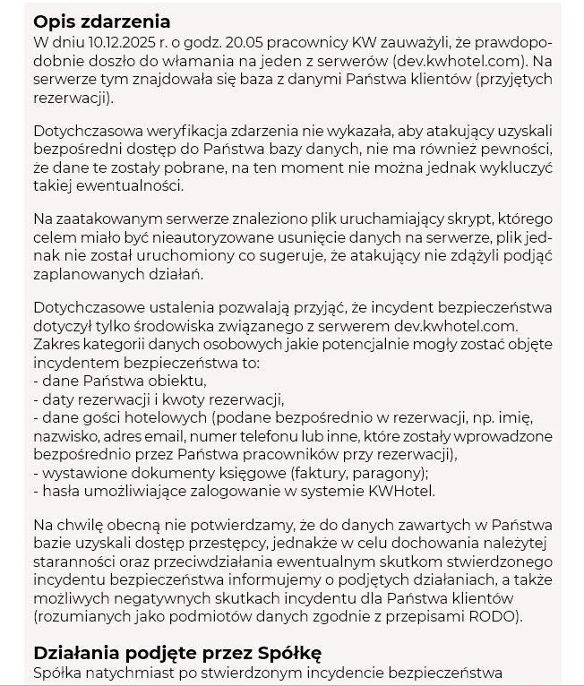“prawdopodobnie doszło do włamania na jeden z serwerów (dev[.]kwhotel[.]pl) Na serwerze znajdowała się baza z danymi Państwa klientów”.
