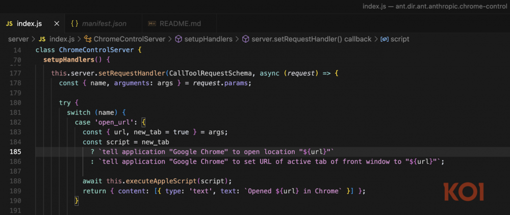 Zaprezentowany na listingu fragment kodu odpowiada za uruchomienie przeglądarki Chrome i odwiedzenie konkretnego adresu URL. Brak filtrowania powoduje, że złośliwie spreparowany URL, będzie zawierał wstrzyknięcie polecenia, które – ze względu na konieczność wywołania przeglądarki wraz z adresem – zostanie wykonane przez serwer MCP.