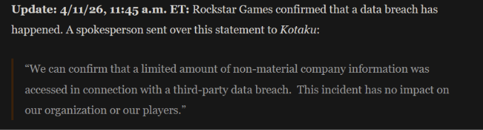 Rzecznik Rockstar Games w rozmowie z redakcją serwisu Kotaku potwierdził fakt wystąpienia incydentu. Starając się ostudzić emocje oraz zminimalizować wagę zdarzenia stwierdził, że atakujący uzyskali dostęp do ograniczonej ilości nieistotnych informacji korporacyjnych. Cyberatak nie wpłynął na infrastrukturę krytyczną ani na bezpieczeństwo graczy.