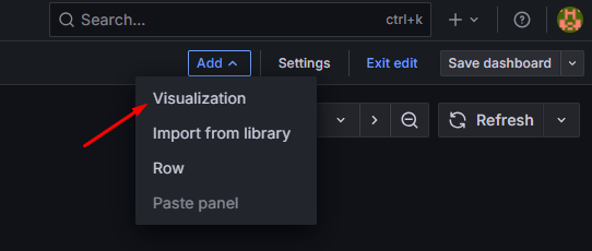 Wracając do Grafany – dodajemy nowy panel klikając “Add” – “Visualization” w prawym górnym rogu: