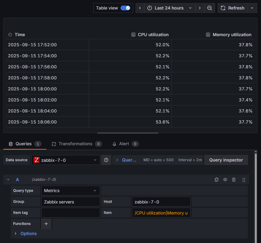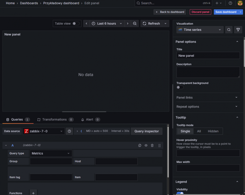 Na razie skupiamy się na lewej dolnej części ekranu, gdzie konfigurujemy zapytanie o dane. Najpierw upewnij się, że ustawione źródło danych “Data source” wskazuje na wcześniej skonfigurowane połączenie do środowiska Zabbix (dla przypomnienia – nazwa “zabbix-7-0”). Pod spodem znajduje się konfiguracja zapytania. Najważniejsze jest ustawienie odpowiedniego typu (“Query type”):