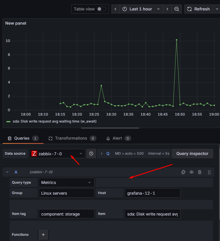 Ponieważ interesują nas dane liczbowe, wybieramy „Metrics”. By pobrać dane o dysku sda na serwerze grafana-12-1, wpisujemy następujące dane:
