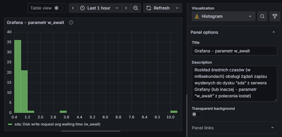 Czas ustawić pierwszy panel. Będzie on pokazywał rozkład średnich czasów obsługi żądań zapisu do dysku „sda” z serwera Grafany (w milisekundach). Mówiąc inaczej — chodzi o parametr „w_await” z polecenia iostat. To jedna z wielu metryk monitoringu dysków dostępnych w oficjalnym szablonie „Linux by Zabbix agent”: