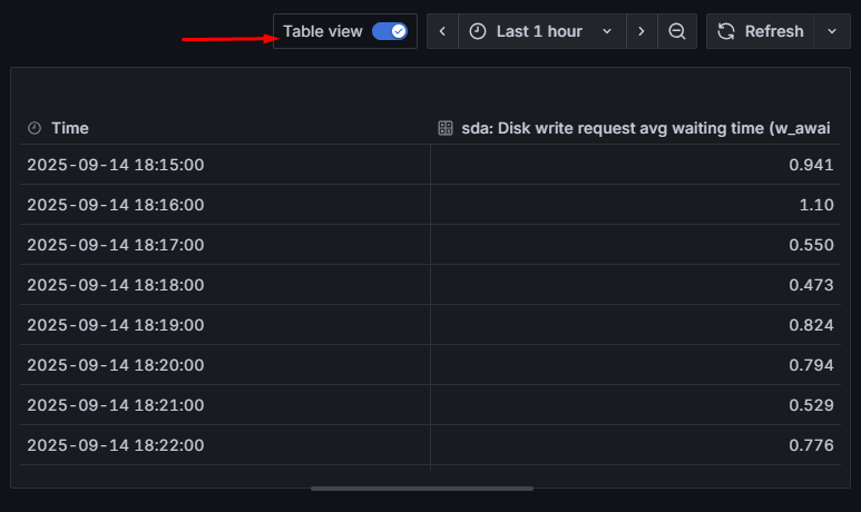 Przydatna wskazówka: jeśli chcesz podejrzeć, jakie dokładnie dane stoją za wykresem, użyj opcji „Table view” (tuż nad konfigurowanym panelem). Wyświetla ona tabelę z aktualnymi wartościami. Będziemy korzystać z tego widoku w kolejnych przykładach, ale to też świetny sposób, żeby szybko sprawdzić, „co siedzi pod spodem”: